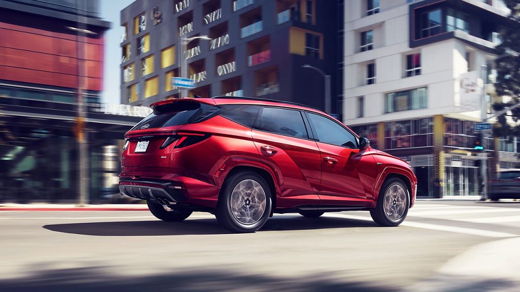 The 2023 Hyundai Tucson is available in four trim levels: SE, SEL, XRT, and N Line. On the SE, you'll find exterior features such as 17-inch alloy wheels, automatic LED headlights, a rear spoiler, and silver front and rear skid plates. The SEL gets you heated side mirrors and a hands-free smart liftgate with auto-open and an adjustable height setting. With the XRT, you get 19-inch wheels, XRT exclusive side classing, and side steps. The N Line comes with premium LED lighting, an exclusive front grille in premium dark chrome accenting, N Line fender badging, and a single twin-tip exhaust.