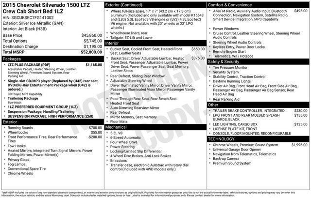 110-Volt AC Power Outlet, 150 Amp Alternator, 4-Wheel Disc Brakes, 4.2 Diagonal Color Display Driver Info Center, 40/20/40 Front Split Bench Seat, 6 Speaker Audio System, 6 Speakers, 6 Rectangular Chromed Tubular Assist Steps, ABS brakes, Air Conditioning, Alloy wheels, AM/FM radio: SiriusXM, Auto-dimming door mirrors, Auto-Dimming Inside Rear-View Mirror, Auto-dimming Rear-View mirror, Automatic temperature control, Auxiliary External Transmission Oil Cooler, Bluetooth® For Phone, Bodyside moldings, Bose Speaker System, Brake assist, Bumpers: chrome, CD player, Chrome Bodyside Moldings, Chrome Cap Power-Adjustable Heated Outside Mirrors, Chrome Door Handles, Chrome Grille w/Chrome Surround, Chrome Mirror Caps, Color-Keyed Carpeting w/Rubberized Vinyl Floor Mats, Compass, Deep-Tinted Glass, Delay-off headlights, Driver & Front Passenger Illuminated Vanity Mirrors, Driver door bin, Driver vanity mirror, Dual front impact airbags, Dual front side impact airbags, Dual-Zone Automatic Climate Control, Electric Rear-Window Defogger, Electronic Stability Control, Emergency communication system: OnStar Directions & Connections, Exterior Parking Camera Rear, EZ Lift & Lower Tailgate, Floor Mounted Console, Front & Rear Molded Black Splash Guards (LPO), Front anti-roll bar, Front Center Armrest w/Storage, Front Chrome Bumper, Front dual zone A/C, Front fog lights, Front Full Feature Power Reclining Bucket Seats, Front Halogen Fog Lamps, Front License Plate Kit, Front reading lights, Front wheel independent suspension, Fully automatic headlights, Garage door transmitter, Heated & Cooled Driver & Front Passenger Seats, Heated door mirrors, Heated Driver & Front Passenger Seats, Heated front seats, Heavy-Duty Rear Locking Differential, Illuminated entry, Integrated Trailer Brake Controller, Leather Appointed Seat Trim, Leather Wrapped Heated Steering Wheel, Leather Wrapped Steering Wheel w/Cruise Controls, LED Cargo Box Lighting, Low tire pressure warning, LTZ Plus Package, Manual Tilt/Telescoping Steering Column, Memory seat, Occupant sensing airbag, OnStar 6 Months Directions & Connections Plan, OnStar w/4G LTE, Outside temperature display, Overhead airbag, Overhead console, Panic alarm, Passenger door bin, Passenger vanity mirror, Power Adjustable Pedals, Power door mirrors, Power driver seat, Power passenger seat, Power Sliding Rear Window, Power steering, Power windows, Power Windows w/Driver Express Up, Premium audio system: Chevrolet MyLink, Radio data system, Radio: AM/FM 8 Diagonal Clr Touch Nav, Radio: AM/FM 8 Diagonal Color Touch Screen, Rear 60/40 Folding Bench Seat (Folds Up), Rear Chrome Bumper, Rear reading lights, Rear seat center armrest, Rear step bumper, Rear Vision Camera w/Dynamic Guide Lines, Rear Wheelhouse Liners, Rear window defroster, Remote Keyless Entry, Remote keyless entry, Remote Vehicle Starter System, Security system, Single Slot CD/MP3 Player, SiriusXM Satellite Radio, Speed control, Speed-sensing steering, Split folding rear seat, Steering Wheel Audio Controls, Steering wheel mounted audio controls, Tachometer, Telescoping steering wheel, Theft Deterrent System (Unauthorized Entry), Tilt steering wheel, Traction control, Trailering Equipment, Trip computer, Turn signal indicator mirrors, Ultrasonic Front & Rear Park Assist, Universal Home Remote, Variably intermittent wipers, Voltmeter, Wheel Locks (Set of 4) (LPO), Wheels: 20 x 9 Chrome. 2015 Chevrolet Silverado 1500 1LZ