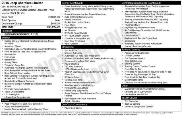 Crafted with an eye for detail, the 2015 Jeep Cherokee Limited boasts a stylish Gray exterior that complements its sleek and modern design. The 18-inch Polished Aluminum wheels and roof rails add a touch of sophistication, while the integrated voice command with Bluetooth® technology keeps you connected on the go.