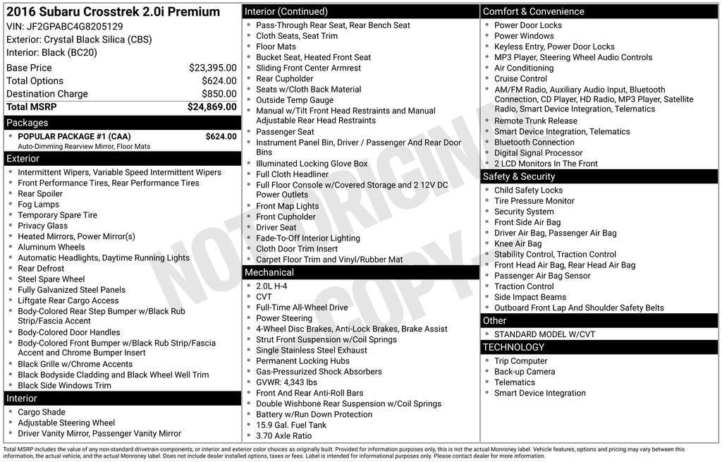 17 x 7.0J Aluminum Alloy Wheels, 3.70 Axle Ratio, 4-Wheel Disc Brakes, 6 Speakers, ABS brakes, Air Conditioning, All Weather Floor Mats, Alloy wheels, AM/FM radio, Auto-Dimming Mirror w/Compass, Brake assist, Bumpers: body-color, CD player, Cloth Upholstery, Driver door bin, Driver vanity mirror, Dual front impact airbags, Dual front side impact airbags, Electronic Stability Control, Emergency communication system: STARLINK, Exterior Parking Camera Rear, Four wheel independent suspension, Front anti-roll bar, Front Bucket Seats, Front Center Armrest, Front fog lights, Front reading lights, Heated door mirrors, Heated Front Bucket Seats, Heated front seats, Illuminated entry, Knee airbag, Low tire pressure warning, Occupant sensing airbag, Outside temperature display, Overhead airbag, Panic alarm, Passenger door bin, Passenger vanity mirror, Popular Package #1, Power door mirrors, Power steering, Power windows, Radio data system, Radio: Subaru Starlink 6.2 Multimedia System, Radio: Subaru Starlink 7.0 Multimedia Plus System, Rear anti-roll bar, Rear Bumper Cover, Rear Seat Back Protector, Rear Vision Camera, Rear window defroster, Rear window wiper, Remote keyless entry, Roof rack: rails only, Security system, Speed control, Speed-sensing steering, Splash Guards, Split folding rear seat, Spoiler, Standard Model w/CVT, Steering wheel mounted audio controls, Subaru Starlink Smartphone Integration, Tachometer, Telescoping steering wheel, Tilt steering wheel, Traction control, Trip computer, Variably intermittent wipers. 2016 Subaru Crosstrek CARFAX One-Owner. Clean CARFAX.