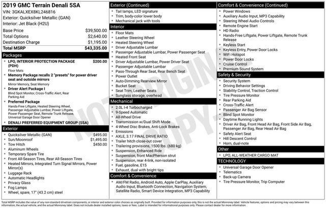 2 USB Data Ports, 2 USB Data Ports w/SD Card Reader, 3.17 Axle Ratio, 4-Wheel Disc Brakes, 6-Way Power Front Passenger Seat, 7 Speakers, 8-Way Power Driver Seat Adjuster, ABS brakes, Air Conditioning, All-Weather Cargo Mat (LPO), All-Weather Floor Mats, Alloy wheels, AM/FM radio: SiriusXM, Apple CarPlay/Android Auto, Auto-dimming door mirrors, Auto-dimming Rear-View mirror, Automatic temperature control, Bluetooth® For Phone, Brake assist, Bumpers: body-color, Compass, Delay-off headlights, Driver & Front Passenger Heated Seats, Driver door bin, Driver vanity mirror, Dual front impact airbags, Dual front side impact airbags, Electronic Stability Control, Emergency communication system, Exterior Parking Camera Rear, Factory Installed Trailer Hitch, Four wheel independent suspension, Front anti-roll bar, Front Bucket Seats, Front Center Armrest, Front dual zone A/C, Front fog lights, Front Passenger 2-Way Power Lumbar, Front reading lights, Fully automatic headlights, Garage door transmitter, HD Radio, Heated door mirrors, Heated front seats, Heated steering wheel, Illuminated entry, Interior Protection Package (LPO), Low tire pressure warning, Memory seat, Navigation System, Occupant sensing airbag, Outside temperature display, Overhead airbag, Overhead console, Panic alarm, Passenger door bin, Passenger vanity mirror, Perforated Leather-Appointed Seat Trim w/Denali Logo, Power door mirrors, Power Driver Lumbar Control, Power driver seat, Power Liftgate, Power passenger seat, Power steering, Power windows, Preferred Equipment Group 5SA, Premium 7-Speaker Bose Sound System w/Amplifier, Radio data system, Radio: GMC Infotainment System w/Navigation, Rear anti-roll bar, Rear seat center armrest, Rear window defroster, Rear window wiper, Remote keyless entry, Roof rack: rails only, Security system, SiriusXM Radio, Skyscape Power Sunroof w/Power Sunscreen, Speed control, Speed-sensing steering, Split folding rear seat, Spoiler, Steering wheel mounted audio controls, Tachometer, Telescoping steering wheel, Tilt steering wheel, Traction control, Trailering Equipment, Trip computer, Turn signal indicator mirrors, Variably intermittent wipers, Wheels: 19 x 7.5 Ultra-Bright Machined Aluminum. 2019 GMC Terrain Clean CARFAX.