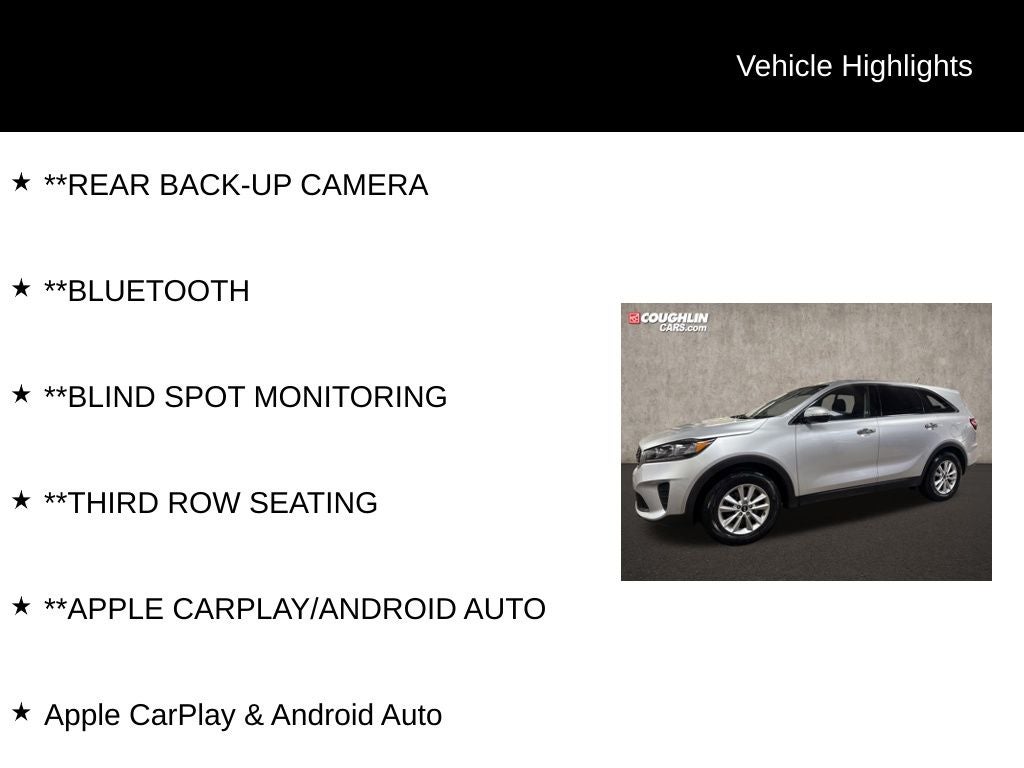 **REAR BACK-UP CAMERA, **Bluetooth®, **BLIND SPOT MONITORING, **THIRD ROW SEATING, **APPLE CARPLAY/ANDROID AUTO, Apple CarPlay & Android Auto, 17 x 7.0 Alloy Wheels, 3.32 Axle Ratio, 3rd row seats: split-bench, 4-Wheel Disc Brakes, 6 Speakers, ABS brakes, Air Conditioning, Alloy wheels, AM/FM radio, Automatic temperature control, Brake assist, Bumpers: body-color, Carpeted Floor Mats (7-Passenger), Delay-off headlights, Driver door bin, Driver vanity mirror, Dual front impact airbags, Dual front side impact airbags, Electronic Stability Control, Exterior Parking Camera Rear, Four wheel independent suspension, Front anti-roll bar, Front Bucket Seats, Front Center Armrest, Front dual zone A/C, Front reading lights, Fully automatic headlights, Heated door mirrors, Illuminated entry, Low tire pressure warning, Occupant sensing airbag, Outside temperature display, Overhead airbag, Overhead console, Panic alarm, Passenger door bin, Passenger vanity mirror, Power door mirrors, Power driver seat, Power steering, Power windows, Radio data system, Radio: UVO Play w/AM/FM/MP3, Rear anti-roll bar, Rear seat center armrest, Rear window defroster, Rear window wiper, Remote keyless entry, Security system, Speed control, Speed-sensing steering, Split folding rear seat, Spoiler, Steering wheel mounted audio controls, Tachometer, Telescoping steering wheel, Tilt steering wheel, Traction control, Trip computer, Turn signal indicator mirrors, Variably intermittent wipers, YES Essentials Cloth Seat Trim, Apple CarPlay & Android Auto.