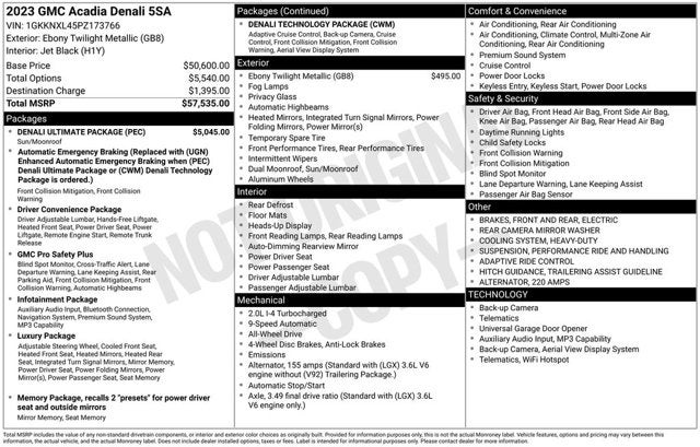 20 Ultra Bright Machined Aluminum Wheels, 220 Amp Alternator, 3rd row seats: split-bench, 4-Wheel Disc Brakes, 6-Passenger (2-2-2 Seating Configuration), 8 Speakers, 8-Way Power Driver Seat Adjuster, 8-Way Power Passenger Seat Adjuster, ABS brakes, Adaptive Cruise Control, Adaptive Ride Control, Air Conditioning, Alloy wheels, AM/FM radio: SiriusXM with 360L, Apple CarPlay/Android Auto, Auto High-beam Headlights, Auto-dimming door mirrors, Auto-dimming Rear-View mirror, Automatic temperature control, Bose Premium 8-Speaker Audio System Feature, Brake assist, Bumpers: body-color, Compass, Delay-off headlights, Denali Technology Package, Denali Ultimate Package, Driver door bin, Driver vanity mirror, Dual front impact airbags, Dual front side impact airbags, Dual SkyScape 2-Panel Power Sunroof, Electronic Stability Control, Emergency communication system: OnStar and GMC connected services capable, Enhanced Automatic Emergency Braking, Four wheel independent suspension, Front & Rear Electric Brakes, Front anti-roll bar, Front Bucket Seats, Front Center Armrest, Front dual zone A/C, Front fog lights, Front reading lights, Fully automatic headlights, Garage door transmitter, HD Surround Vision, Heads-Up Display, Heated & Ventilated Driver & Front Passenger Seats, Heated door mirrors, Heated Driver & Front Passenger Seats, Heated front seats, Heated Rear Outboard Seating Positions, Heated rear seats, Heated steering wheel, Heavy-Duty Cooling System, Hitch Guidance w/Hitch View, Illuminated entry, Knee airbag, Low tire pressure warning, Memory seat, Navigation System, Occupant sensing airbag, Outside temperature display, Overhead airbag, Overhead console, Panic alarm, Passenger door bin, Passenger vanity mirror, Perforated Leather-Appointed Seat Trim, Performance Ride & Handling Suspension, Power door mirrors, Power Driver Lumbar Control Seat Adjuster, Power driver seat, Power Liftgate, Power Passenger Lumbar Control Seat Adjuster, Power passenger seat, Power steering, Power windows, Preferred Equipment Group 5SA, Radio data system, Radio: AM/FM 8 Diagonal Multi-Touch Navigation, Rear air conditioning, Rear anti-roll bar, Rear Camera Mirror, Rear Camera Mirror Washer, Rear reading lights, Rear window defroster, Rear window wiper, Remote keyless entry, Roof rack: rails only, Security system, SiriusXM w/360L, Speed control, Speed-sensing steering, Spoiler, Steering wheel memory, Steering wheel mounted audio controls, Tachometer, Telescoping steering wheel, Tilt steering wheel, Traction control, Trailering Assist Guidelines, Trailering Package, Trip computer, Turn signal indicator mirrors, Variably intermittent wipers, Ventilated front seats, Voltmeter, Wireless Apple CarPlay/Wireless Android Auto. 2023 GMC Acadia Clean CARFAX.