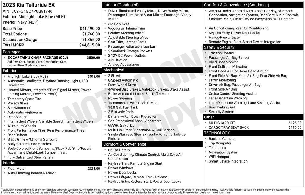 The Telluride EX's 3.8L V6 engine delivers an exceptional blend of power and efficiency, with 20 city/26 highway MPG to keep you on the road longer. Its spacious interior and versatile cargo capacity make it the perfect companion for your family's adventures.