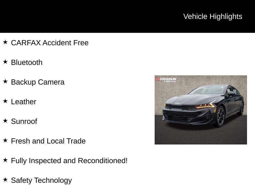 Under the hood, this K5 GT-Line boasts a powerful 1.6L I4 DGI Turbocharged engine that delivers an impressive 180 horsepower, mated to an 8-speed automatic transmission. With its exceptional fuel efficiency, you'll enjoy an EPA-estimated 27 MPG in the city and 37 MPG on the highway, making it an economical choice for your daily commute or weekend adventures.