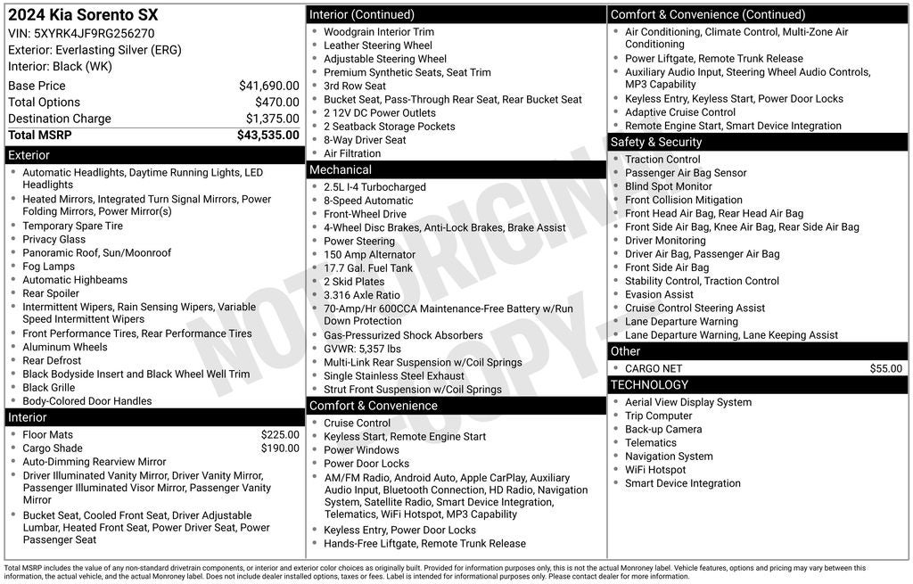 Equipped with 3.316 Axle Ratio, 3rd row seats: split-bench, 4-Wheel Disc Brakes, 6 Speakers, ABS brakes, Air Conditioning, Alloy wheels, AM/FM radio: SiriusXM, Apple CarPlay & Android Auto, Auto High-beam Headlights, Auto-dimming Rear-View mirror, Automatic temperature control, Brake assist, Bumpers: body-color, Cargo Cover, Cargo Net, Carpeted Floor Mats, Delay-off headlights, Driver door bin, Driver vanity mirror, Dual front impact airbags, Dual front side impact airbags, Electronic Stability Control, Emergency communication system: 911 Connect, Exterior Parking Camera Rear, Four wheel independent suspension, Front anti-roll bar, Front Bucket Seats, Front Center Armrest, Front dual zone A/C, Front fog lights, Front reading lights, Fully automatic headlights, Heated & Ventilated Front Bucket Seats, Heated door mirrors, Heated front seats, Illuminated entry, Knee airbag, Leather steering wheel, Low tire pressure warning, Navigation System, Occupant sensing airbag, Outside temperature display, Overhead airbag, Overhead console, Panic alarm, Passenger door bin, Passenger vanity mirror, Power door mirrors, Power driver seat, Power Liftgate, Power moonroof, Power passenger seat, Power steering, Power windows, Radio data system, Radio: AM/FM Audio System, Rain sensing wipers, Rear anti-roll bar, Rear reading lights, Rear side impact airbag, Rear window defroster, Rear window wiper, Remote keyless entry, Security system, Smart Key w/ Push Button and Remote Start, Speed control, Speed-sensing steering, Split folding rear seat, Spoiler, Steering wheel mounted audio controls, SynTex Artificial Leather Seat Trim, Tachometer, Telescoping steering wheel, Tilt steering wheel, Traction control, Trip computer, Turn signal indicator mirrors, Variably intermittent wipers, Ventilated front seats, and Wheels: 8.5J x 20 Gloss Black Alloy.